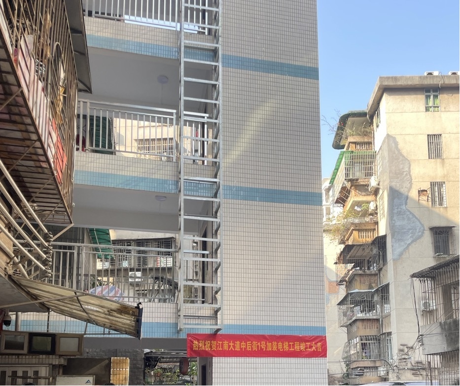 2025年1月,海珠区江南大道中后街某楼电梯加装工程在结束4年“长跑”后正式竣工并投入使用。该居民楼为异形设计,面临设计方案复杂、协调住户意见难度大、加装成本高等问题。为此,海珠区分局派专业设计人员多次实地勘探,根据该楼特殊地理位置初步制定了设计方案,并结合群众协调意见不断调整优化,如井道设置在楼宇入口,二层以上用连廊与各楼层阳台、客厅、房间连接等。同时,采取“连片”加建形式降低电梯加装成本,成功推动项目落地。